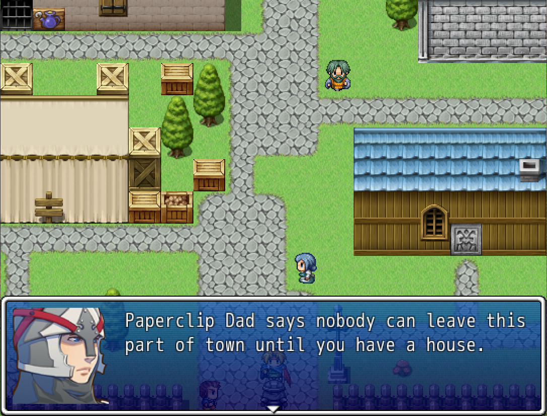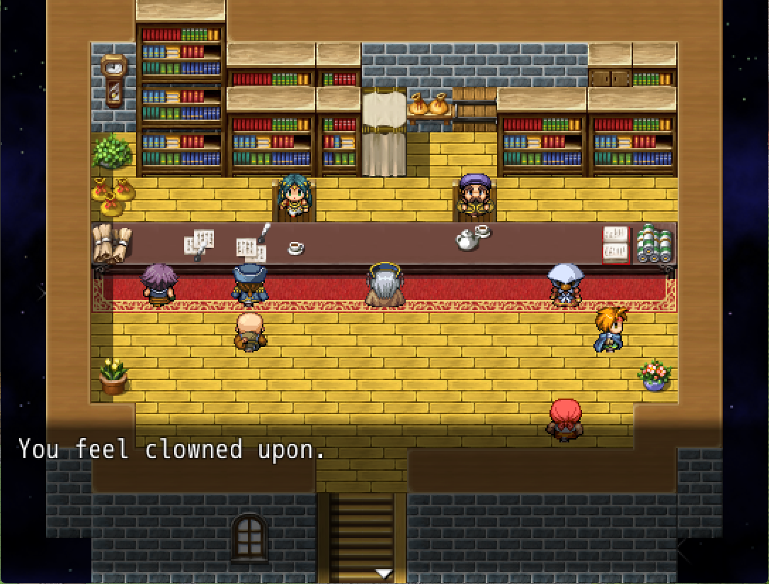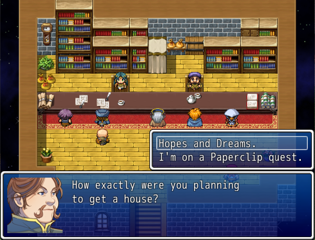 The original idea of this was a nonsense driven item trade up game, but that was boring. So I ended up overloading it with all sorts of storyline stuff and simple puzzle's. Though you can still feel the raw nonsense of a lot of my plot decisions. By the end I did have a plot in mind, I didn't really build around it, so much as slap it on top of what I already made.